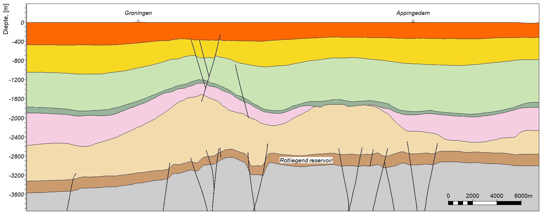 The Groningen gas field reservoir is the Upper Rotliegend Group of Early Permian age (Figure 1). Figure 2 shows a cross-section through the entire reservoir. The reservoir is located at depths of between 2600 and 3200m. The total thickness of the Rotliegend in the Groningen field ranges from approximately 100m in south-southeast to approximately 300m in north-northwest. From east to west the Rotliegend thickness is fairly uniform. The Upper Rotliegend Group has been subdivided into the Slochteren Formation (reservoir rock) and the Silverpit Formation (non-reservoir rock). The Slochteren Formation is a sequence of conglomerates and course-grained sandstone layers deposited in sheet floods and fluvial braiding channel fills, interbedded with fluvial medium-grained sandstone layers deposited in a desert plain and finer-grained aeolian dune and sand-flat deposits. The Slochteren Formation is overlain by the Ten Boer and Ameland Members of the Silverpit Formation. The claystone of the Ameland Member is restricted to the northern part of the Groningen field, where it separates the Slochteren Formation in the Upper and Lower Slochteren Formations, and forms a potential barrier to flow. The Ten Boer and Ameland Members were deposited in the southern Permian Basin, which at the time comprised a desert lake environment. The gas now contained in the Slochteren Formation is migrated from the coal layers in the underlying Carboniferous. The thick impermeable salt and anhydrite layers of the overlying Zechstein Group form the seal that traps the gas in the Rotliegend reservoir rock.