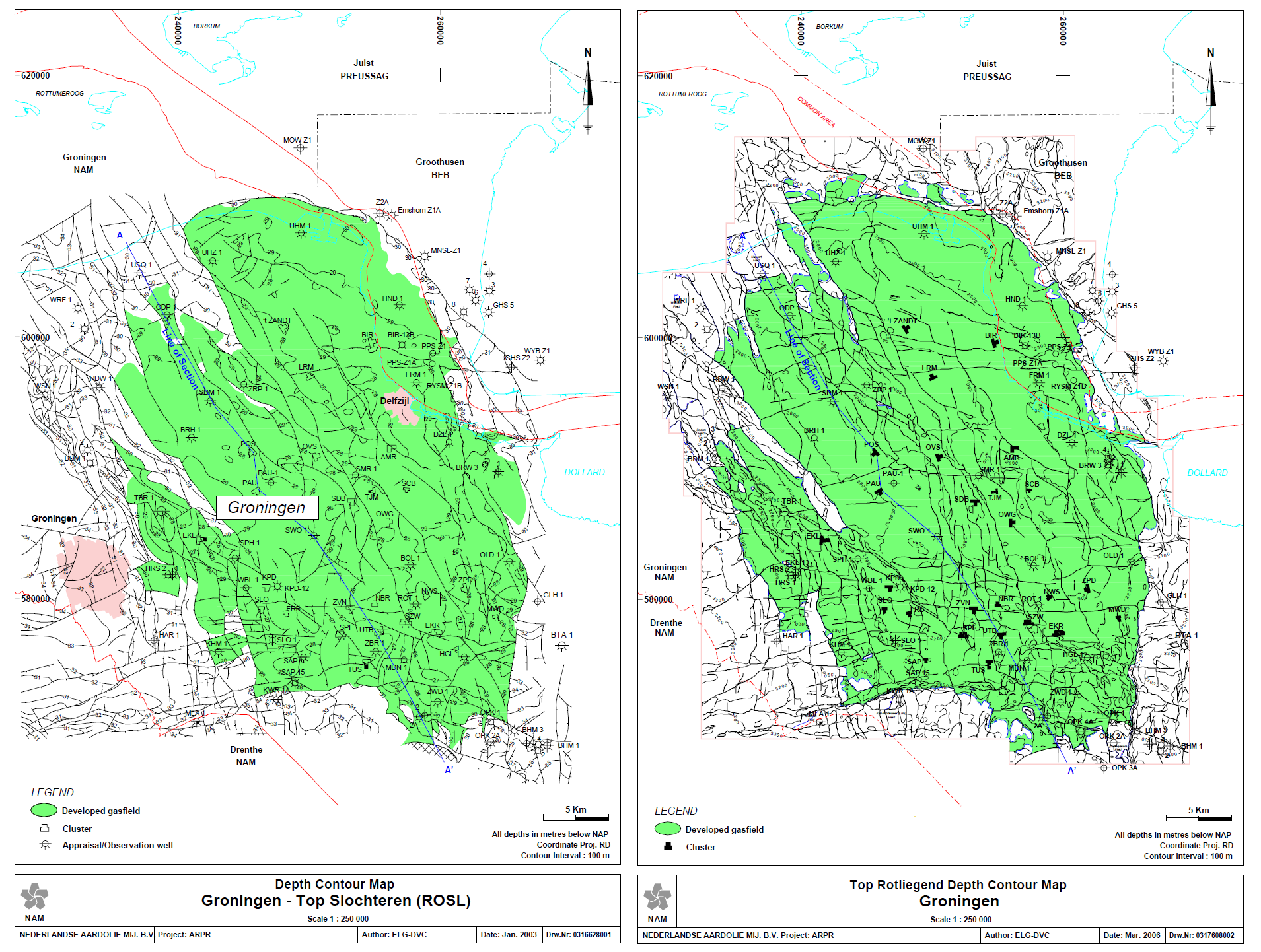Figure 1 Structure map of Groningen gas field. The depth contours represent respectively the top of the Slochteren Formation (left) and the top of the Rotliegend (right)