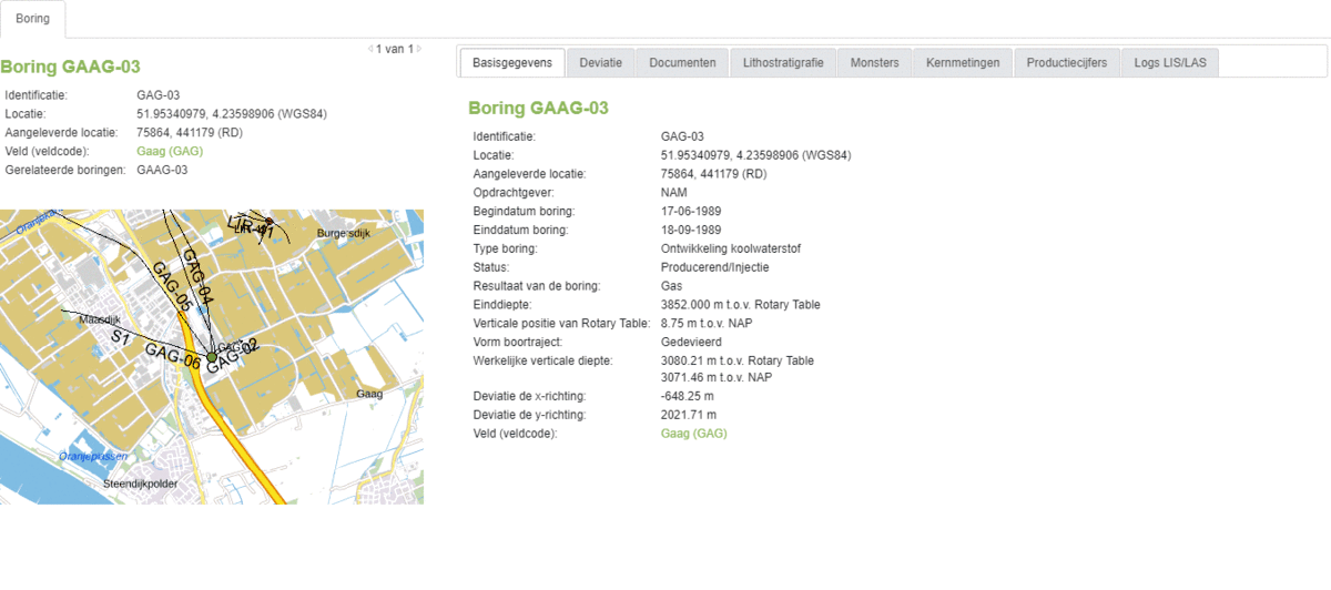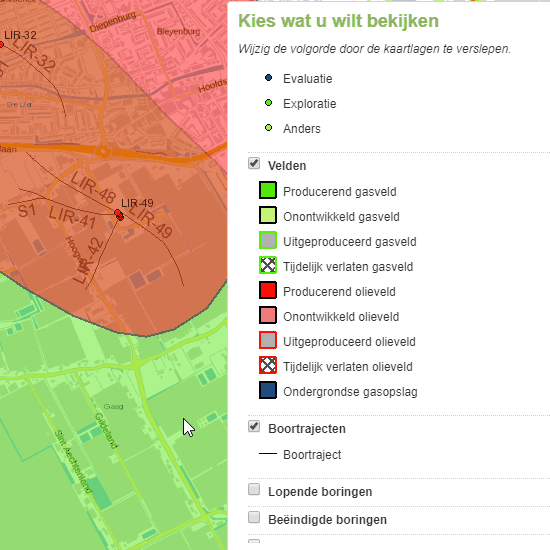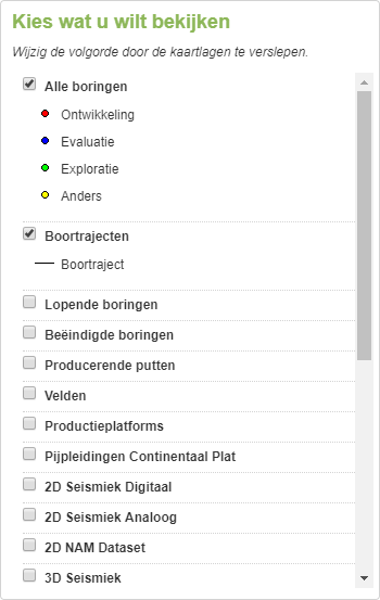 Als u de interactieve kaart opent, wordt heel Nederland en het Nederlandse deel van het continentaal plat weergegeven. Aan de rechterkant van het scherm vindt u een overzicht met verschillende kaartlagen. De kaartlagen bevatten verschillende gegevenscategorieën en kunnen worden in- en uitgeschakeld, waardoor ze wel of niet worden weergegeven op de kaart. Bij aanvang zijn de kaartlagen "Alle boringen" en "Boortrajecten" ingeschakeld. Als u boringen in een specifieke categorie wilt zien, dient u dus eerst de kaartlaag "Alle boringen" uit te schakelen.