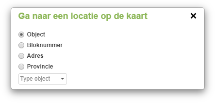 - Hiermee kan er een specifiek object gezocht worden door het type object (Boring, Vergunning of Veld) te selecteren en de identificatie in te voeren.
